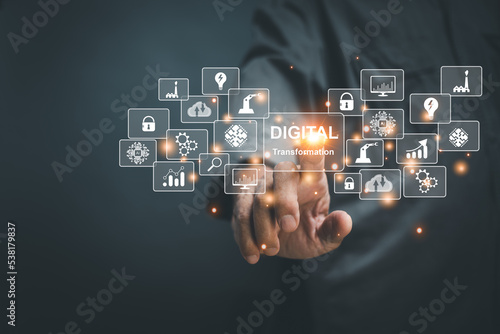 Wall mural businessman touching virtual screen for digitalization of business processes and data, optimize and