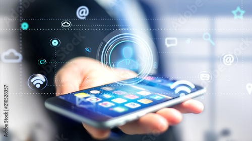Wall mural : Businessman using a smartphone with a contact icon surrounding by app and social icon - 3d render