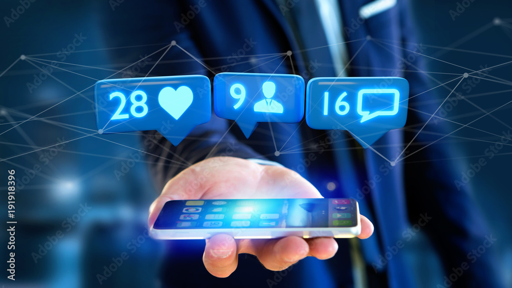 Wall mural businessman using a smartphone with a like, follower and message notification on social network - 3d - Wall murals Wall mural businessman using a smartphone with a like, follower and message notification on social network - 3d - Wall murals