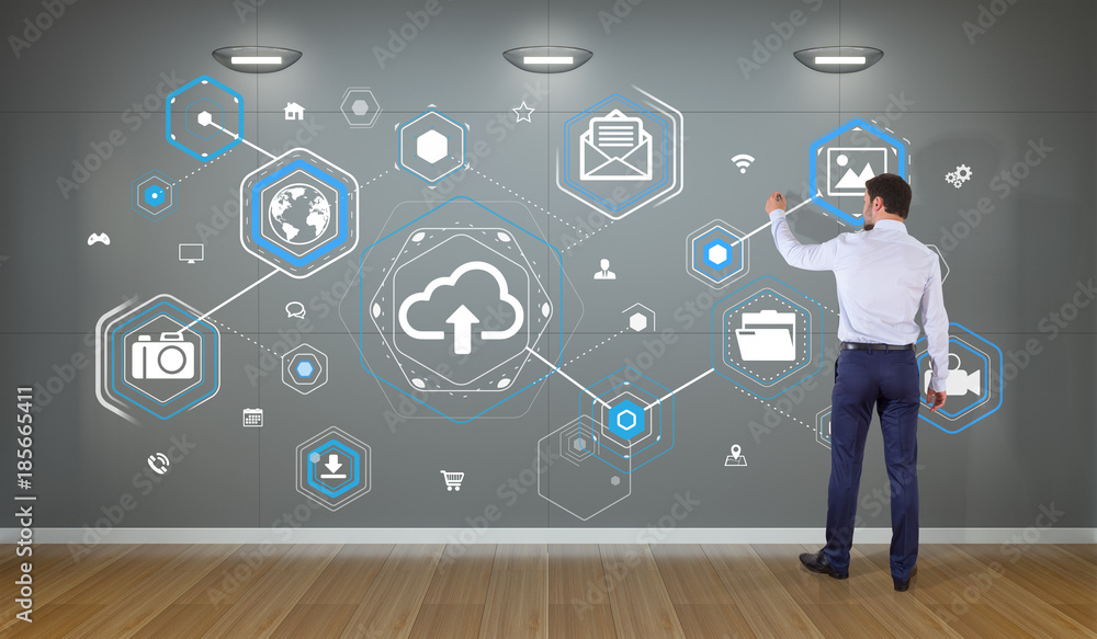 Wall mural businessman using cloud interface on a wall 3d rendering - Wall murals Wall mural businessman using cloud interface on a wall 3d rendering - Wall murals