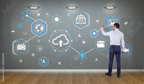 Wall mural : Businessman using cloud interface on a wall 3d rendering