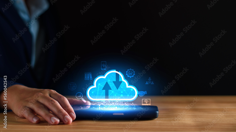 Wall mural businessman using cloud technology connect business data. cloud computing concept idea show on hand. - Wall murals Wall mural businessman using cloud technology connect business data. cloud computing concept idea show on hand. - Wall murals