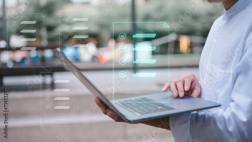 Wall mural businessman using computer laptop outdoor with virtual document icon in concept of document and data - Wall murals Wall mural businessman using computer laptop outdoor with virtual document icon in concept of document and data - Wall murals