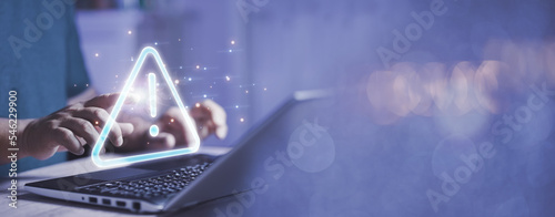 Wall mural businessman using computer laptop with triangle caution warning sing for notification error and main