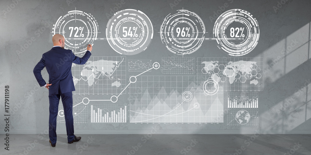 Wall mural businessman using graph screens interface on a wall 3d rendering - Wall murals Wall mural businessman using graph screens interface on a wall 3d rendering - Wall murals
