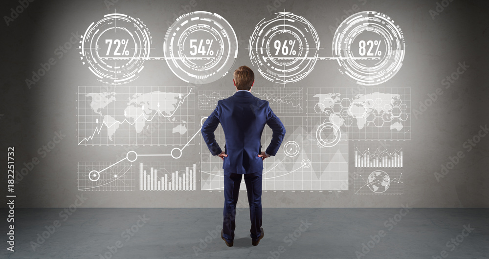Wall mural businessman using graph screens interface on a wall 3d rendering - Wall murals Wall mural businessman using graph screens interface on a wall 3d rendering - Wall murals