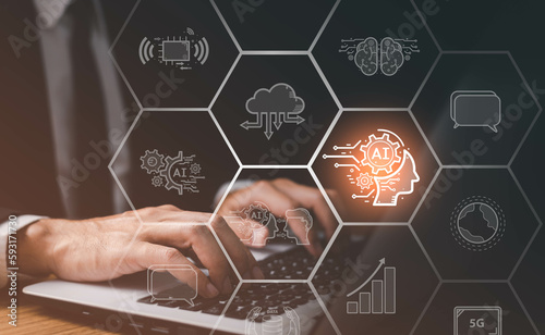 Wall mural : Businessman using laptop keyboard to chat with ai or artificial intelligence for chatbot by open ai