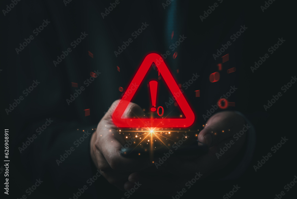 Wall mural businessman using mobile phone red triangle warning sign with exclamation point for error notificati - Wall murals Wall mural businessman using mobile phone red triangle warning sign with exclamation point for error notificati - Wall murals