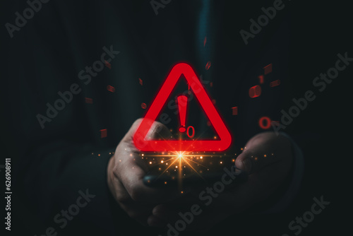 The watermark will not be included on Wall mural.: Businessman using mobile phone red triangle warning sign with exclamation point for error notificati