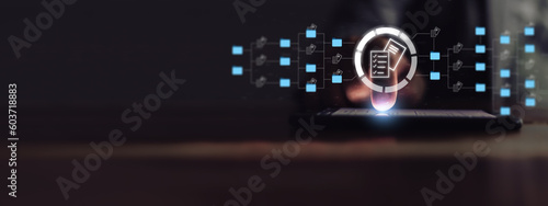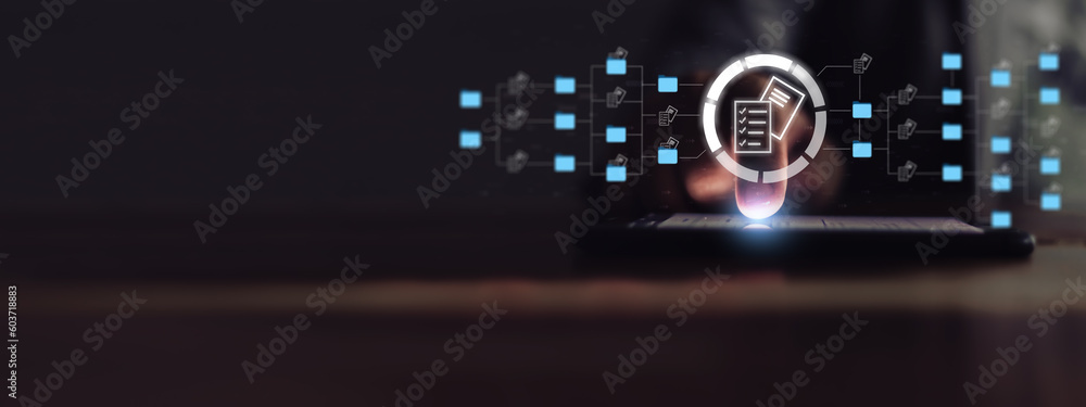 Wall mural : Businessman using phone to document management concept, online documentation database and digital fi