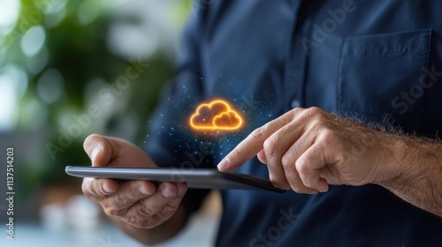Wall mural businessman using smartphone with cloud icon displayed on digital interface on his desk in a modern  - Wall murals Wall mural businessman using smartphone with cloud icon displayed on digital interface on his desk in a modern - Wall murals