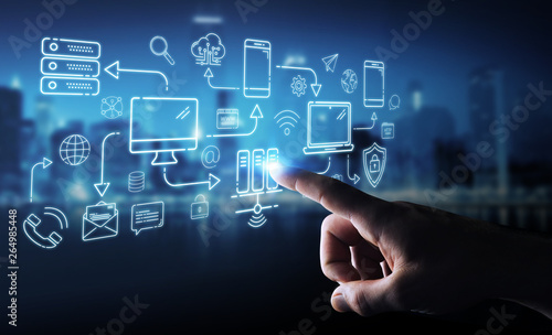 Wall mural businessman using tech devices and icons thin line interface - Wall murals Wall mural businessman using tech devices and icons thin line interface - Wall murals