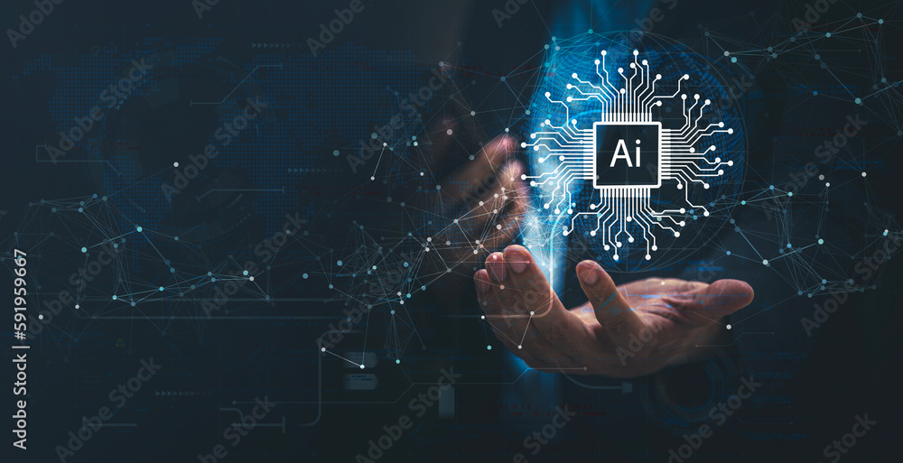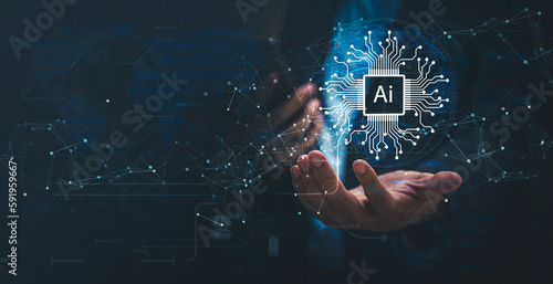 Wall mural businessman using technology smart robot ai, artificial intelligence, futuristic technology transfor - Wall murals Wall mural businessman using technology smart robot ai, artificial intelligence, futuristic technology transfor - Wall murals