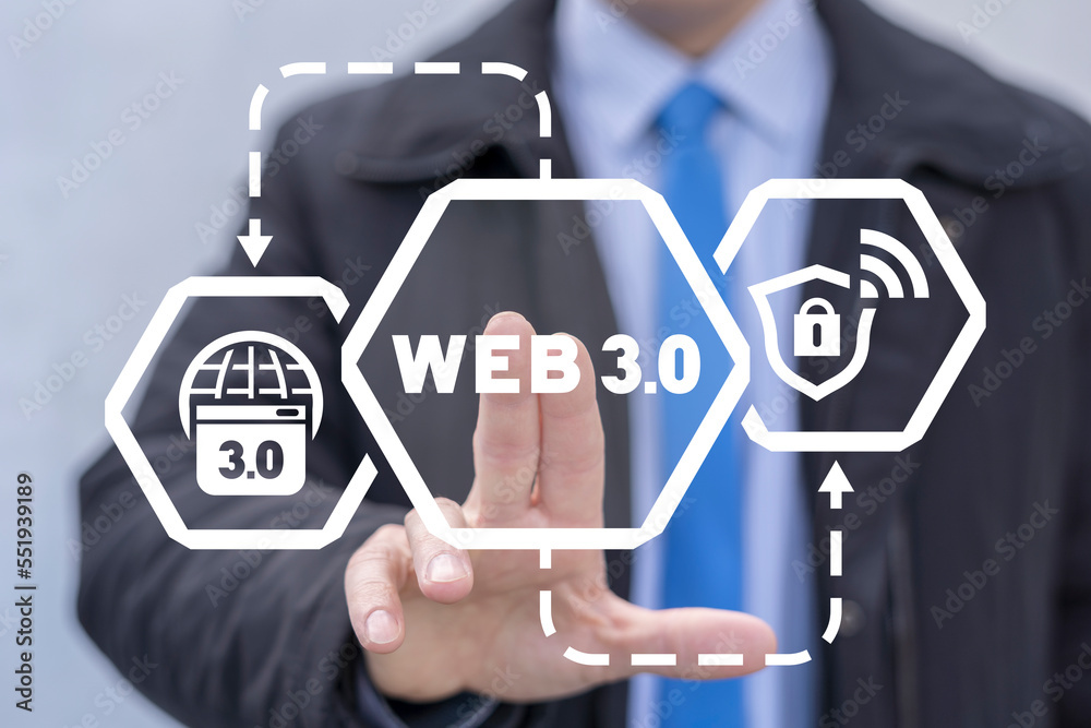 Wall mural businessman using virtual touchscreen presses inscription: web 3.0. concept of futuristic decentrali