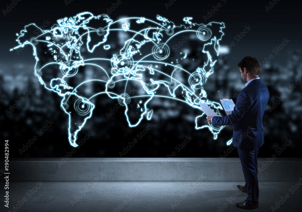 Wall mural businessman watching drawing manuscript world map connection on a rooftop 3d rendering - Wall murals Wall mural businessman watching drawing manuscript world map connection on a rooftop 3d rendering - Wall murals
