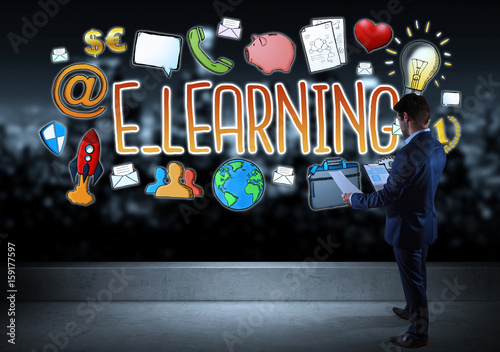 Wall mural businessman watching e-learning sketch on a rooftop 3d rendering