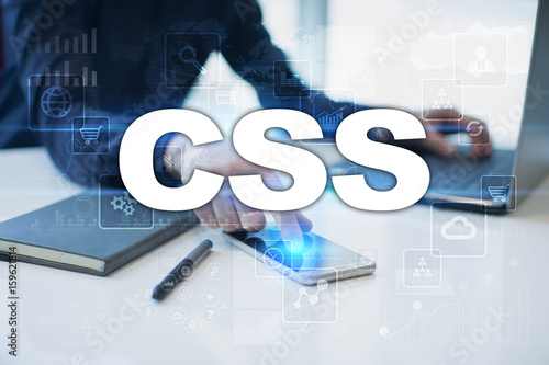 The watermark will not be included on Wall mural.: Businessman working in office, pressing button on virtual screen and selecting css -