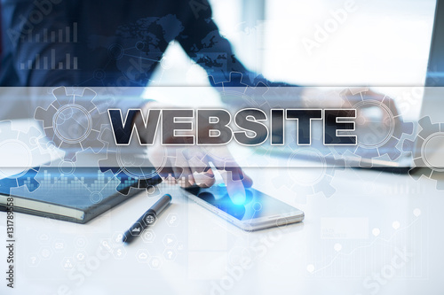 The watermark will not be included on Wall mural.: Businessman working in office, pressing button on virtual screen and selecting website -