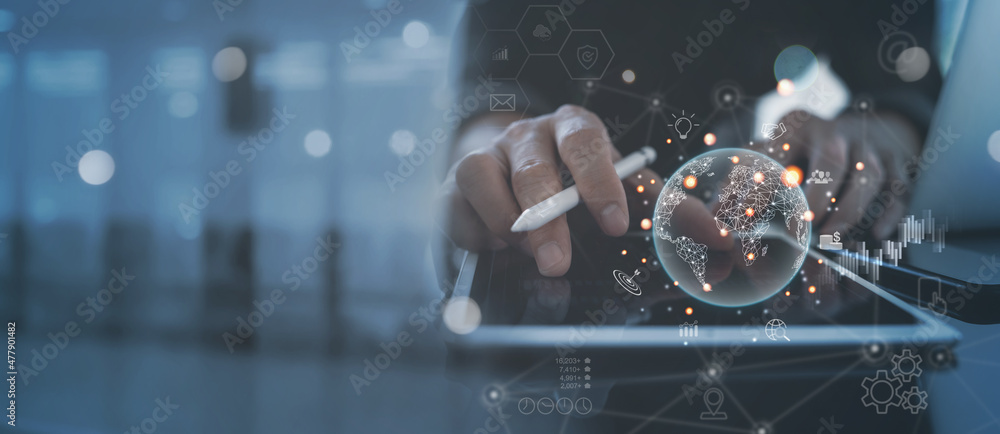 Businessman working on digital tablet computer with global internet network connection technology, dWall mural
