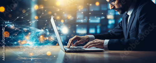 Wall mural businessman working on laptop synchronizing business data with global network, showcasing data trans - Wall murals Wall mural businessman working on laptop synchronizing business data with global network, showcasing data trans - Wall murals