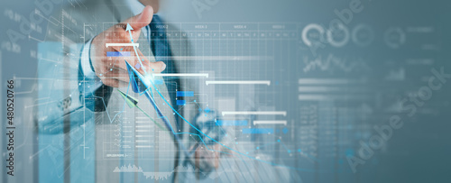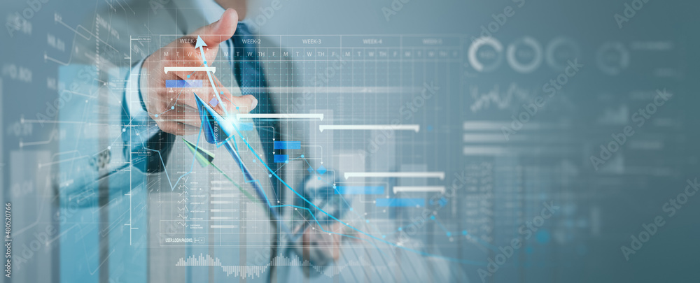 Wall mural businessman working with modern computer virtual dashboard analyzing innovation finance sales data a - Wall murals Wall mural businessman working with modern computer virtual dashboard analyzing innovation finance sales data a - Wall murals