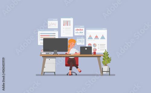 Wall mural businesswoman at a desk with multiple screens displaying graphs, charts, and analytical data charact