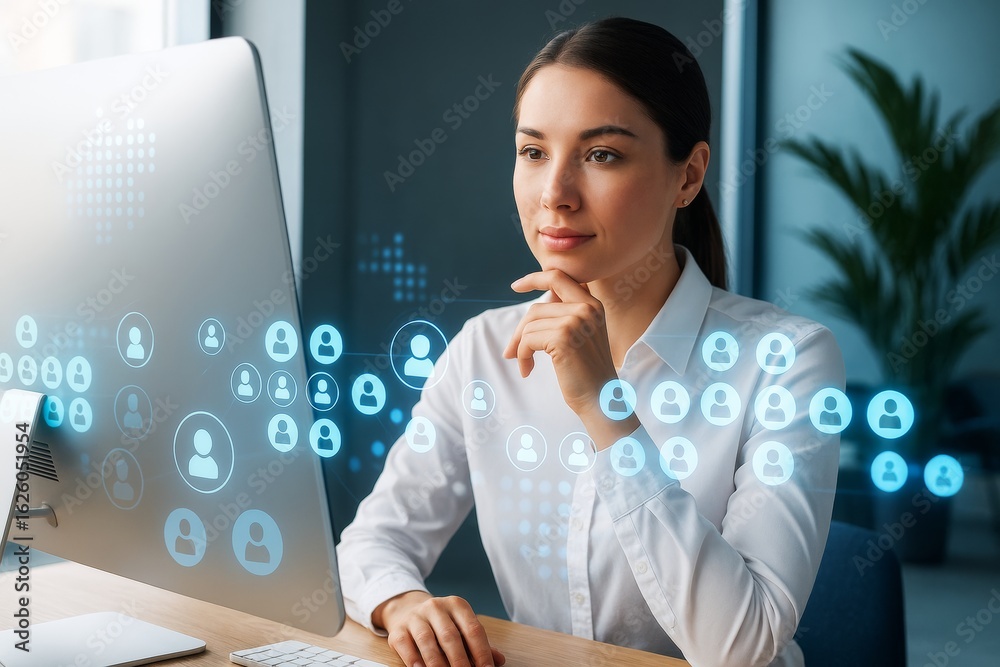 Businesswoman using digital network technology interface on computer in modern office background witWall mural