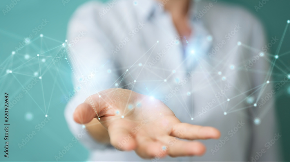 Wall mural businesswoman using futuristic connection interface 3d rendering - Wall murals Wall mural businesswoman using futuristic connection interface 3d rendering - Wall murals