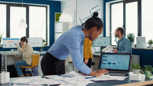 Wall mural busy african american in startup putting clipboard on desk looking at papers with sales charts compa - Wall murals Wall mural busy african american in startup putting clipboard on desk looking at papers with sales charts compa - Wall murals