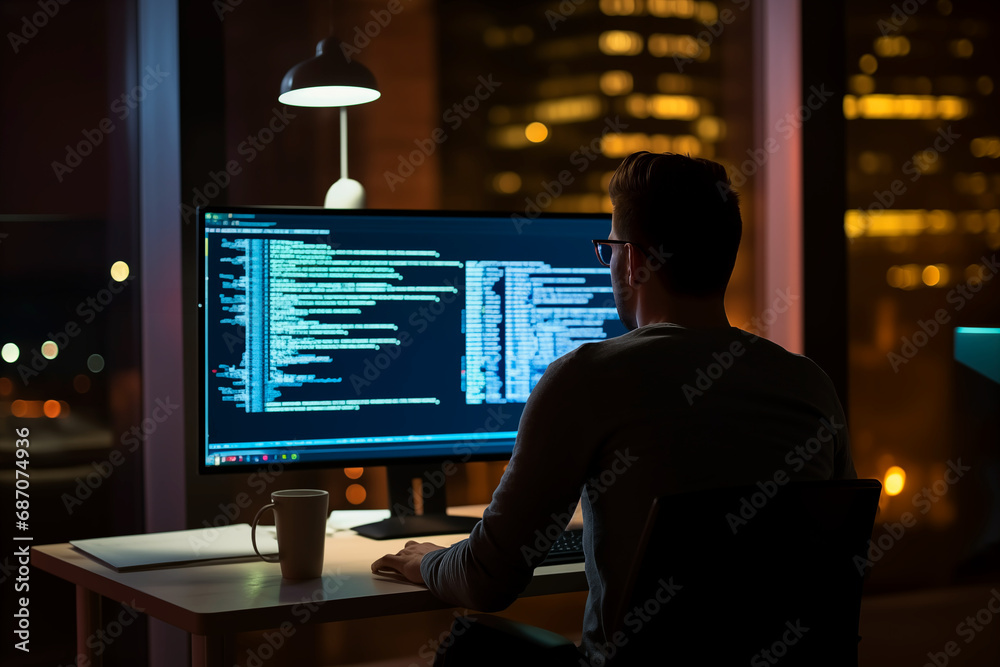 The watermark will not be included on Wall mural.: Busy smart business man software developer engineer programmer working late on pc computer in dark n