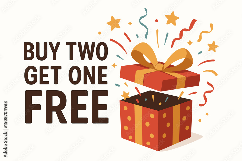 The watermark will not be included on Wall mural.: Buy two get one free sale vector illustration - exploding red gift box with confetti and stars, perfe