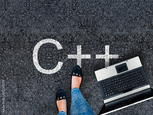 Wall mural c++ programming language. .a woman steps to a laptop and c++ on asphalt road - Wall murals Wall mural c++ programming language. .a woman steps to a laptop and c++ on asphalt road - Wall murals