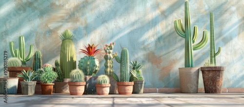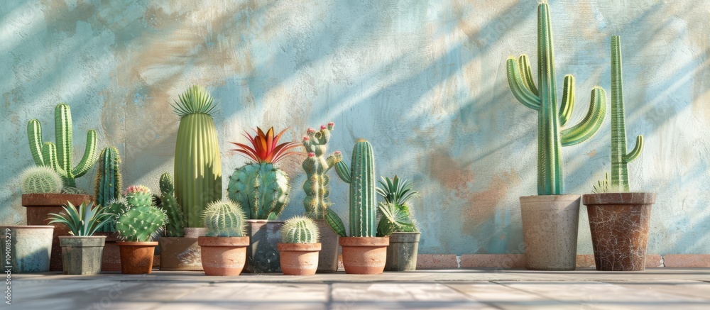 Wall mural cacti in assorted small pots elegantly arranged for a charming small garden with copy space image