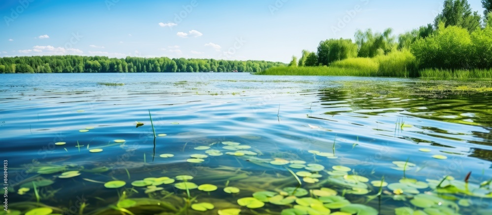 The watermark will not be included on Wall mural.: Calm lake surface surrounded by greenery and lily pads with trees in the background - with copy space