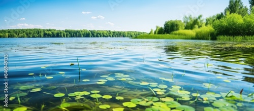 Wall mural calm lake surface surrounded by greenery and lily pads with trees in the background. with copy space