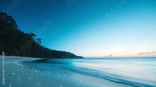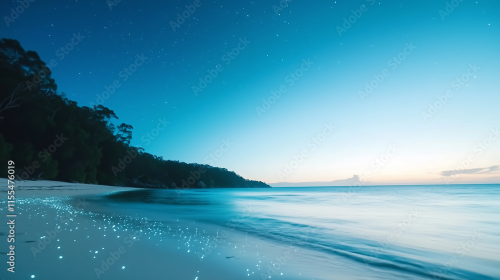 The watermark will not be included on Wall mural.: Calm twilight beach view with soft waves lapping against the shore and a serene sky in the backgroun