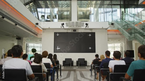Wall mural : Camera moves along pass between waiting for lecture listeners