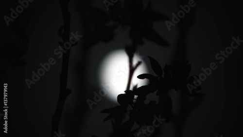 The watermark will not be included on Wall mural.: Camera rack focus from silhouetted tree branches to full moon and clouds passing at night -