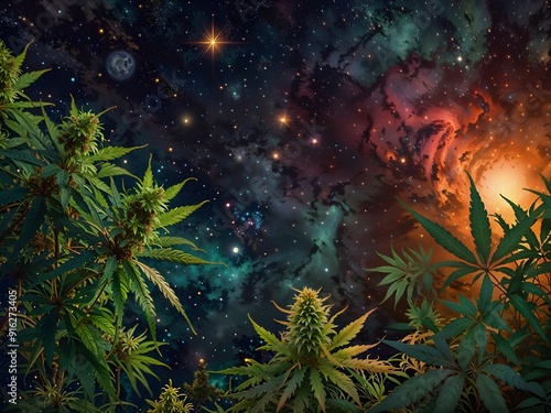 The watermark will not be included on Wall mural.: Cannabis plants in the moonlit night starry sky, room for text
