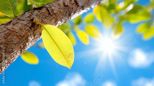 The watermark will not be included on Wall mural.: Captivating sunlight and leaf a close up view of a tree branch with a vibrant green leaf bathed in t