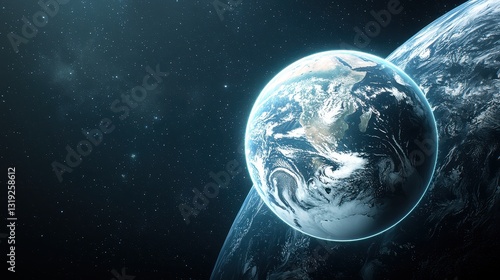 The watermark will not be included on Wall mural.: Captivating view of earth from space displaying the planet's surface with glowing lights against a m