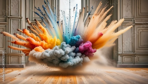 The watermark will not be included on Wall mural.: Capturing vibrant particles bursting outward from a central point, radiating dynamic energy and move