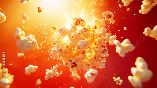 The watermark will not be included on Wall mural.: Carton of popcorn exploding on a red background, flying popcorn
