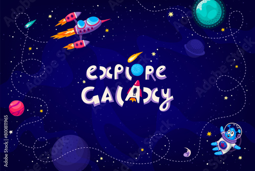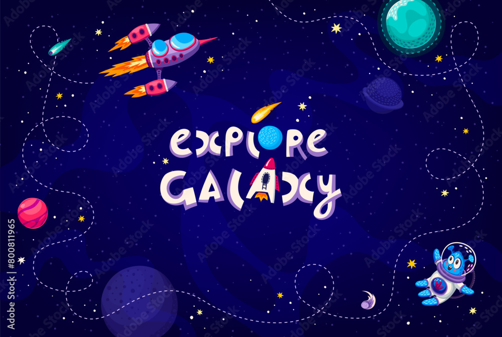 The watermark will not be included on Wall mural.: Cartoon galaxy space background with rocket path, stars and alien, vector poster - outer space frame