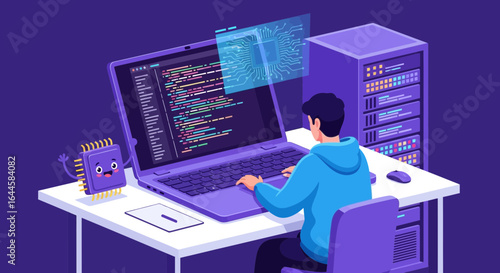 Cartoon illustration of a programmer coding with chip character and server rackWall mural