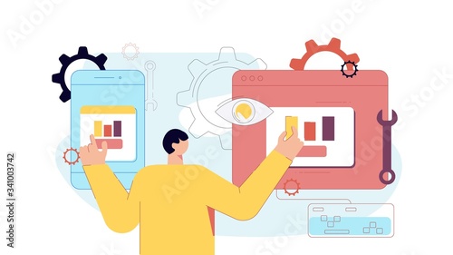 Wall mural cartoon male developer testing application of smartphone and computer pc vector flat illustration. s