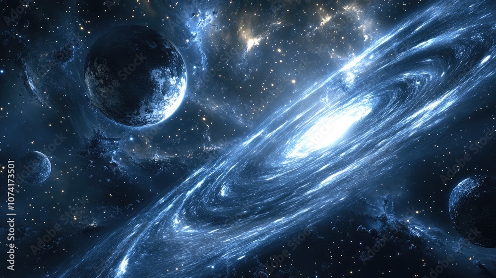 Wall mural : Cartoon rendering in 3d of galaxies stars and planets in outer space displaying the wonders of space