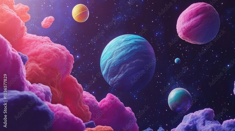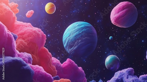 The watermark will not be included on Wall mural.: Cartoon rendering in 3d of planets and a nebula in space