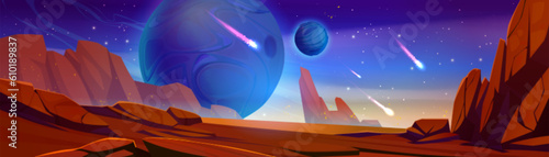 The watermark will not be included on Wall mural.: Cartoon space planet game vector background illustration - night fantasy mars ground surface with fal