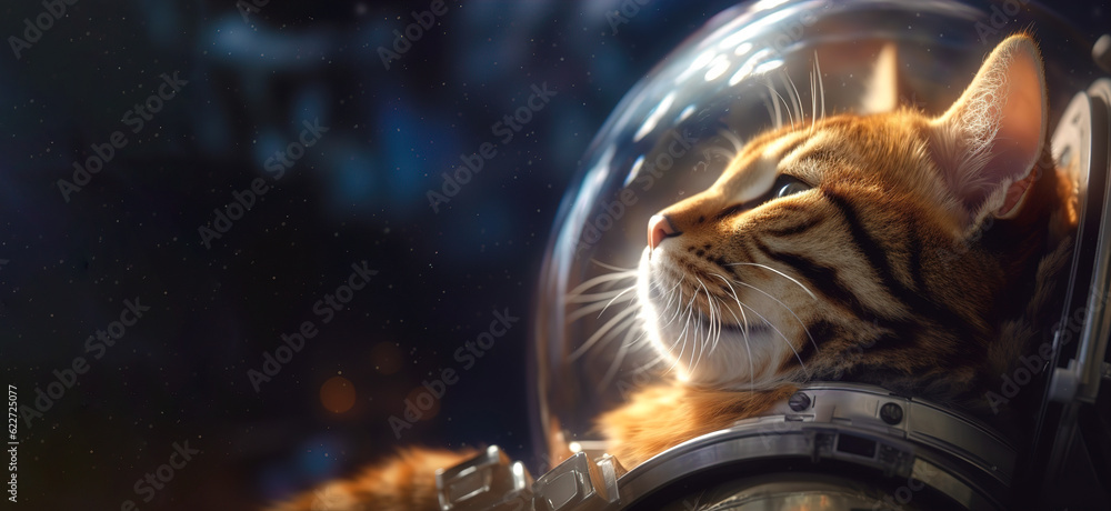 The watermark will not be included on Wall mural.: Cat astronaut in a spacesuit in outer space - banner, copy space - ai generation